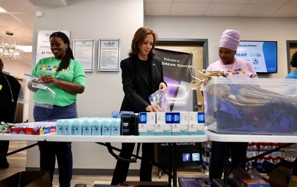 U.S. Vice President Kamala Harris helps prepare hygiene kits at a medical clinic where the nonprofit NC Counts Coalition prepares and then delivers them to victims of Hurricane Helen in Charlotte, North Carolina, on October 5, 2024.