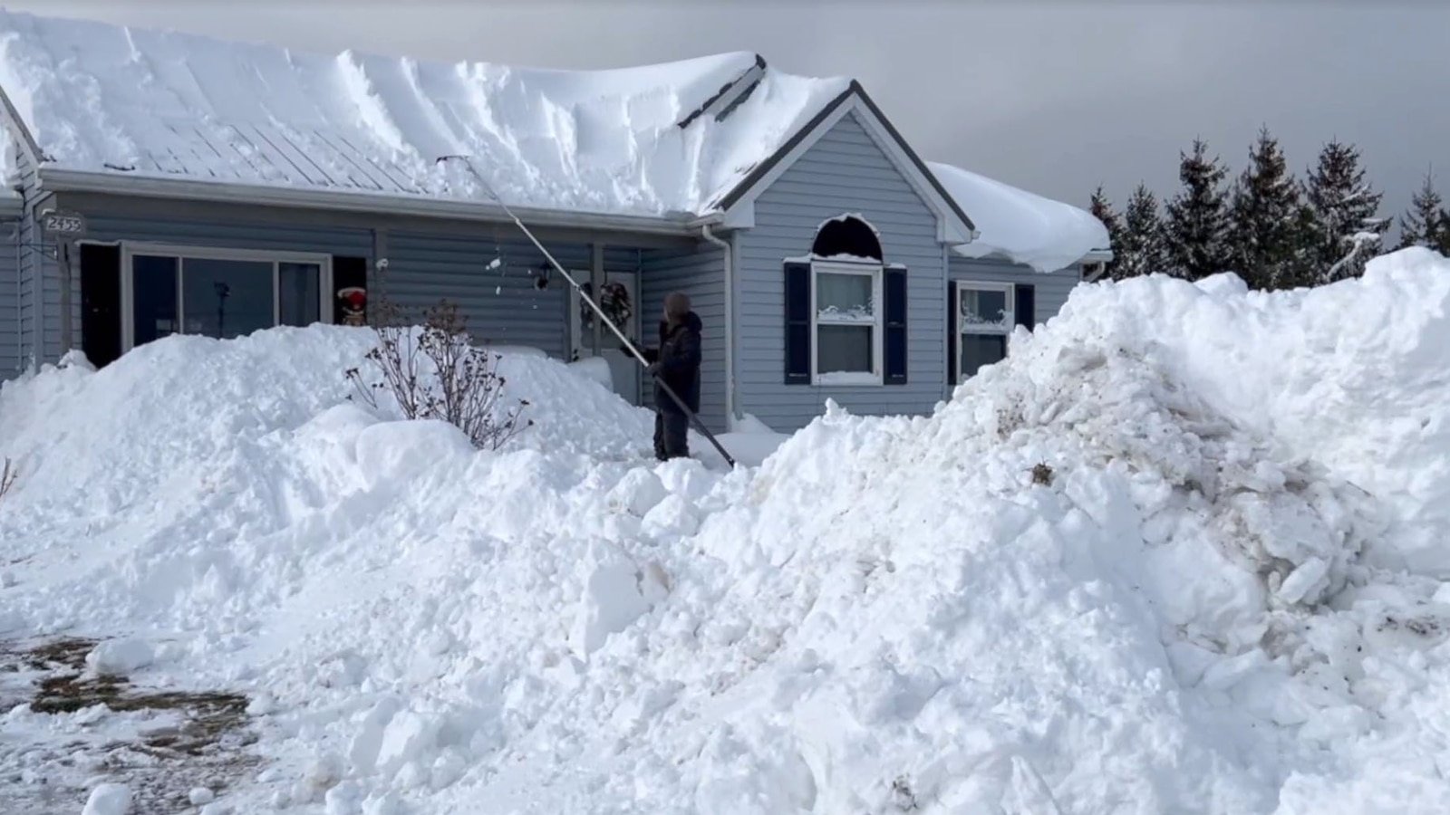 In this screenshot from a video, a man removes snow from a roof in Eden, New York on December 13, 2024.