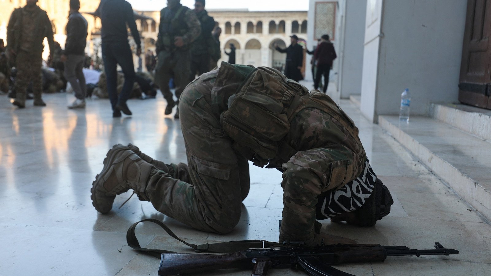 An anti-government fighter prays in the courtyard of the historic Umayyad mosque in the Syrian capital Damascus on December 8, 2024.